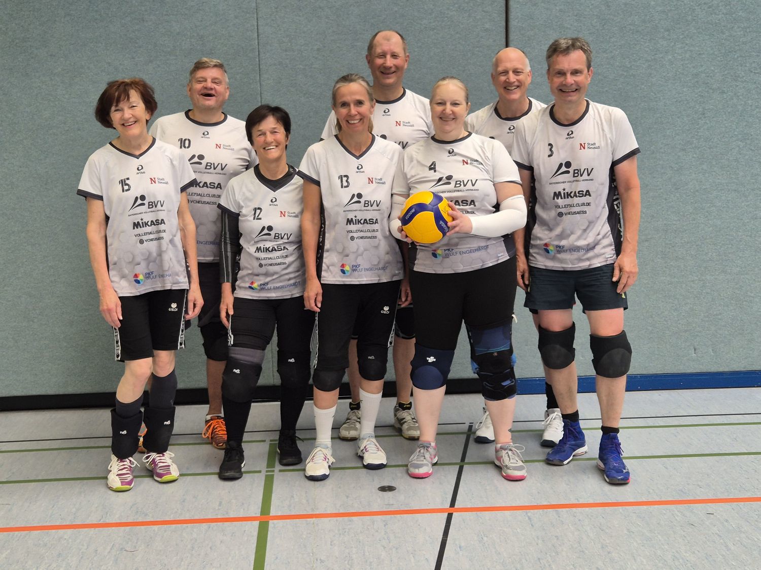 Die beiden Mannschaften unseres Vereins, vertreten in den Altersklassen 1 und 4, hielten tapfer dagegen, mussten sich jedoch der starken Konkurrenz – zum Teil deutlich jüngerer Teams – geschlagen geben. Während das Team in der AK1 mit einem respektablen fünften Platz das Turnier beendete, sorgten unsere „Unberechenbaren“, das erfahrene Team aus der AK4, für eine faustdicke Überraschung: Mit drei gewonnenen Sätzen sicherten sie sich den ersten Platz ihrer Altersklasse und dürfen sich nun inoffizieller Deutscher Meister im Senioren Mixed-Volleyball nennen.