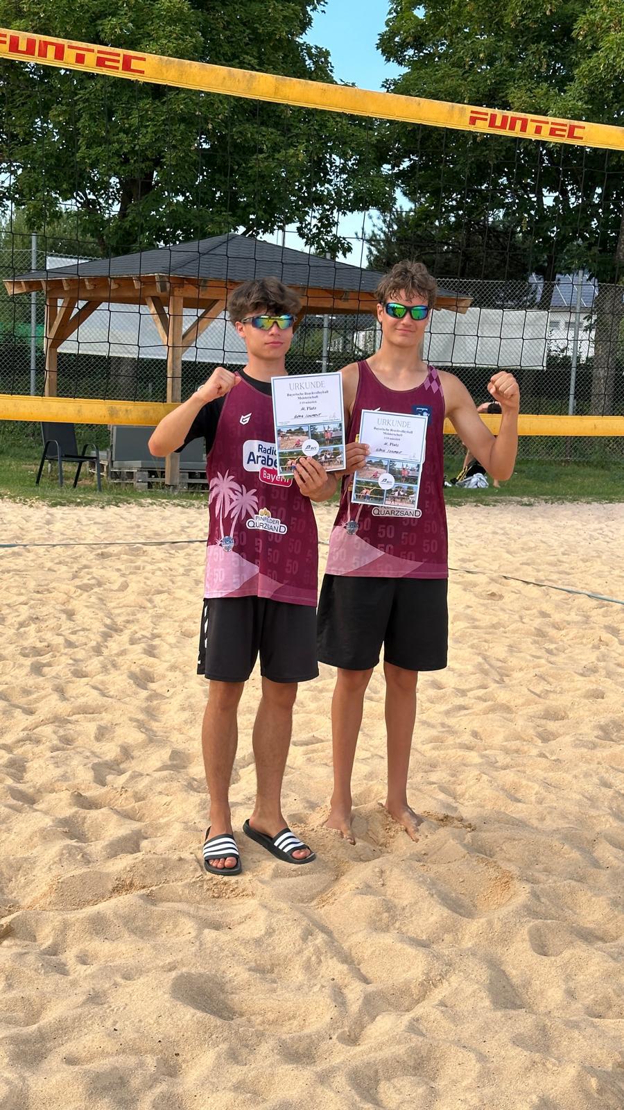 Amberg – Trotz sommerlicher Temperaturen und harter Konkurrenz haben unsere Jungs Simon Görig und Phillippe Laurent am Wochenende bei den BVV Meisterschaften U19 im Beachvolleyball eine beeindruckende Leistung gezeigt. Mit gerade einmal 15 und 16 Jahren stellten sich die beiden Nachwuchsspieler der deutlich älteren und erfahreneren Konkurrenz und belegten am Ende einen respektablen 11. Platz unter 16 teilnehmenden Teams.